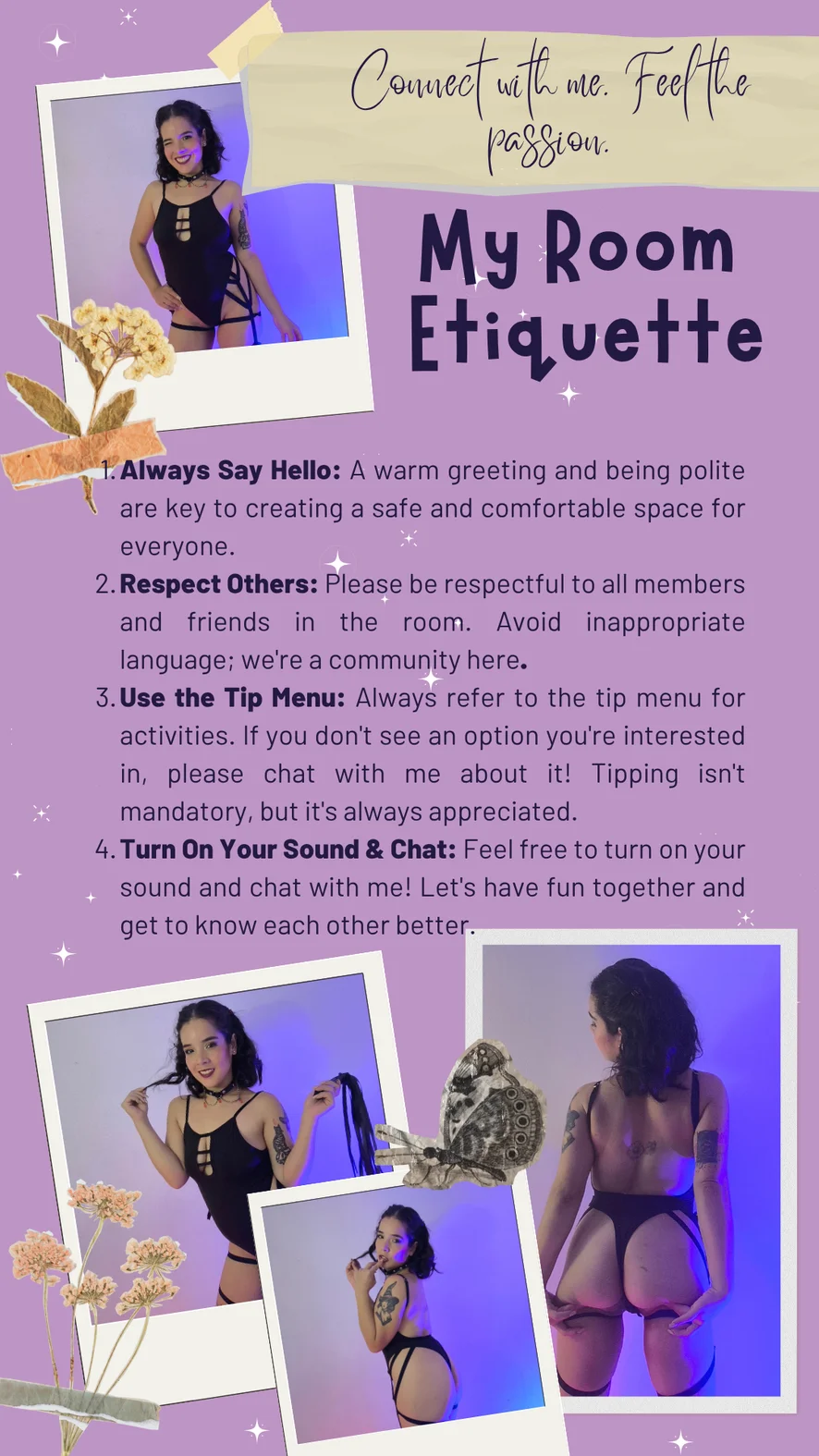 No spam, no demands, no rudeness. Ask with manners, enjoy the vibe, tip if you love, and let’s make this space magical, playful & unforgettable together 💞