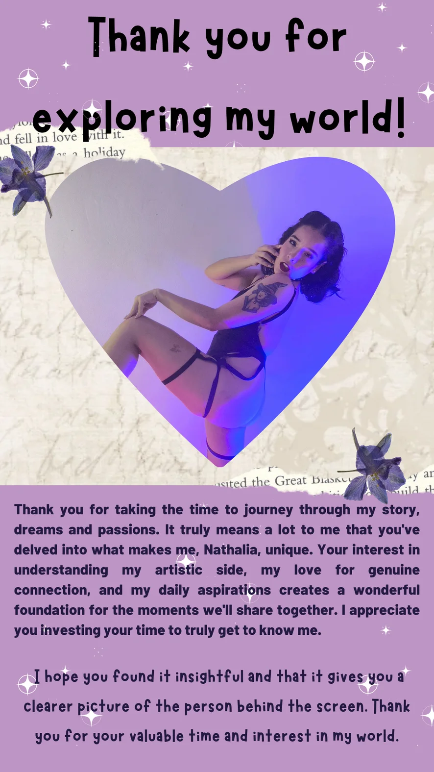 💋 Hey, I’m Nathalia — a passionate lover with a creative soul and a taste for meaningful connection. 🎨📖 I adore art, music, reading, and deep, intelligent conversations that spark both the mind and the body. There’s a quiet confidence in me that’s irresistibly sexy, a mix of warmth and mystery that invites you to explore and play. 🔥 I love diving into the depths of sensuality, creativity, and genuine human connection. 💫 Come share energy, laughter, and fantasy with me online — ⏱️I’m live from Wetday to Moanday, 6:30 PM to 10:30 PM (GTM-5) ⏱️ Let’s create moments that feel unforgettable. 💕