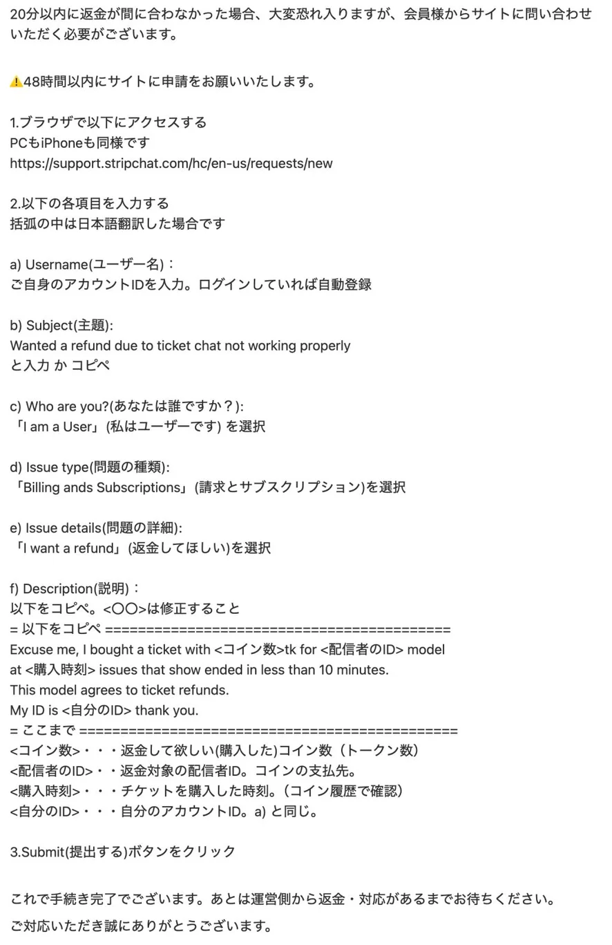 チケットチャット配信を開始して5分以降・下着を脱いだ状態=全裸で回線が落ちてしまった際は返金対応を行っておりません。